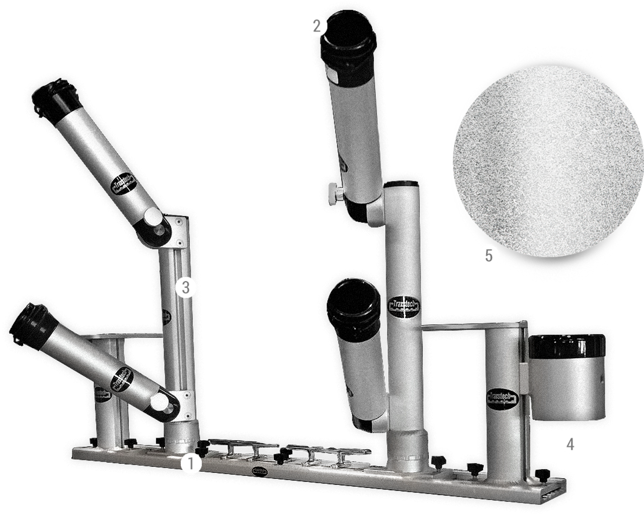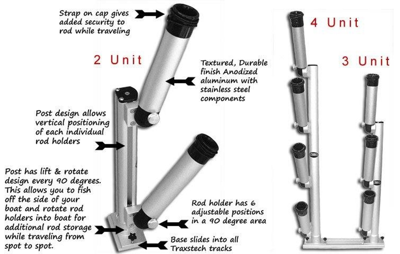 Traxstech offers vertical rod trees with 2, 3 or 4 rod holders that slide into our mounting track system. If you use in-line planer boards for lead core, copper line or just long lining this is the ultimate rod holder system for you. Our exclusive post design allows independent rod holder adjustability. Each rod holder has six available positions in a 90-degree area for maximum spread of rod tips, allowing easier turns virtually tangle free. The concept of the vertical rod tree mounted as far forward as possible allows full gunwale for the board rods, divers, and corner downriggers, keeping the transom completely open for netting and resetting baits.We have also used this vertical tree in situations where space is limited and the top holders were used for boards and the bottom one for a diver rod.